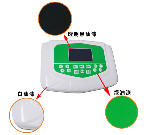 噴油:在手板的表面噴上一層油漆,使手板外觀更精美。在這個經絡治療儀手板中,外殼噴的是白色的油漆,中間部分噴的是綠色油漆,顯示屏用的是透明材料亞克力做的,然后在噴上一層透明黑。